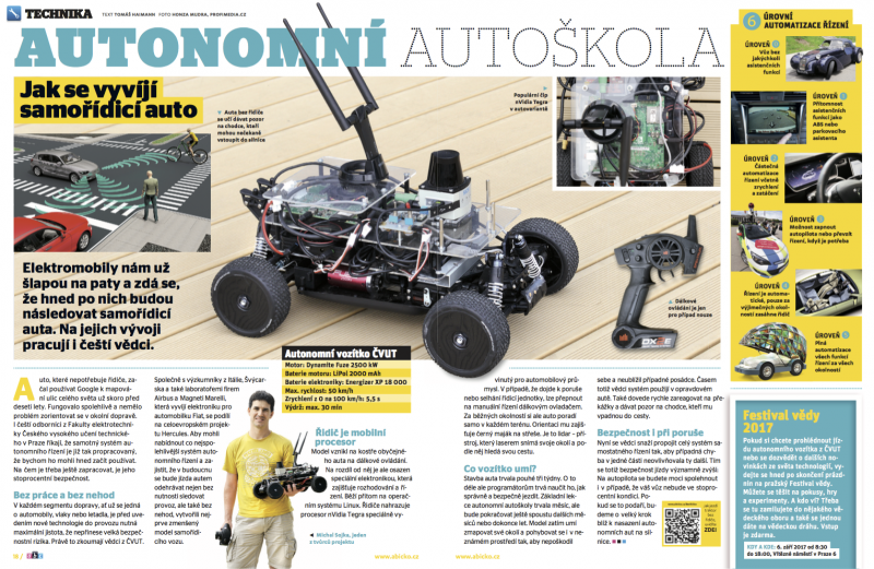 Our autonomous car model attracts attention The current issue of a popularization journal ABC reviews our autonomous car model F1/10. Find out more here [in Czech]